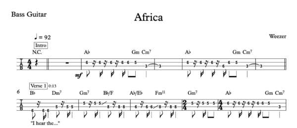 Bass Guitar Tablature for “Africa” by Weezer