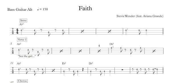 Bass Guitar Alt Tablature for “Faith” by Stevie Wonder (feat. Ariana Grande).