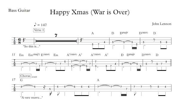 Bass Guitar Tablature for “Happy Xmas (War is Over)” by John Lennon.