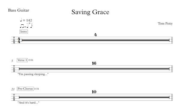 Bass Guitar Tablature for “Saving Grace” by Tom Petty.