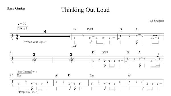 Bass Guitar Tablature for “Thinking Out Loud” by Ed Sheeran.