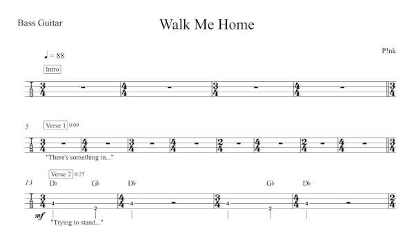 Bass Guitar Tablature for “Walk Me Home” by Pink.