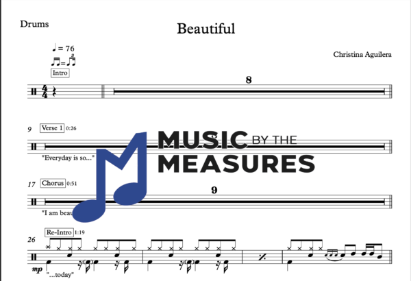 Drum Sheet Music for “Beautiful” by Christina Aguilera