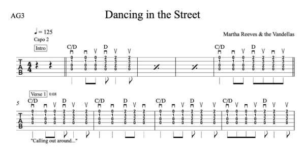 Strum Guitar Tablature for “Dancing in the Street” by Martha Reeves & the Vandellas