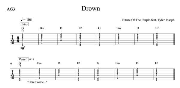 Strum Guitar Tablature for “Drown” by Future Of The Purple feat. Tyler Joseph