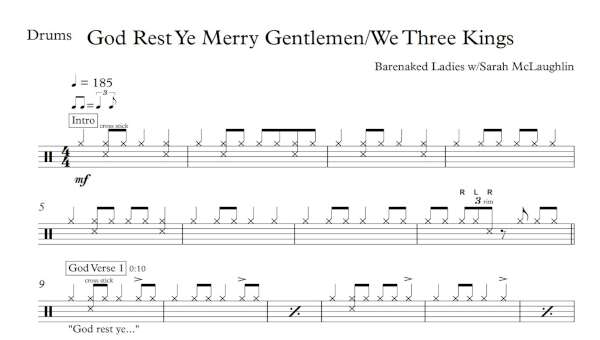 You need to be a member to be able to purchase this tab. Sign up nowDrum Sheet Music for “God Rest Ye Merry Gentlemen/We Three Kings” by Barenaked Ladies with Sarah McLaughlin.