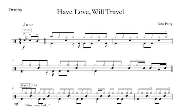 Drum Sheet Music for “Have Love, Will Travel” by Tom Petty & The Heartbreakers.
