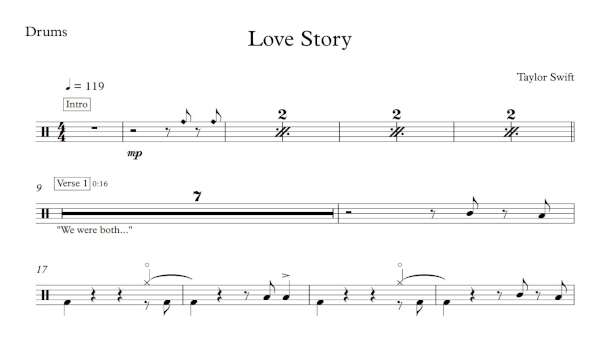 Drum Sheet Music for “Love Story” by Taylor Swift.