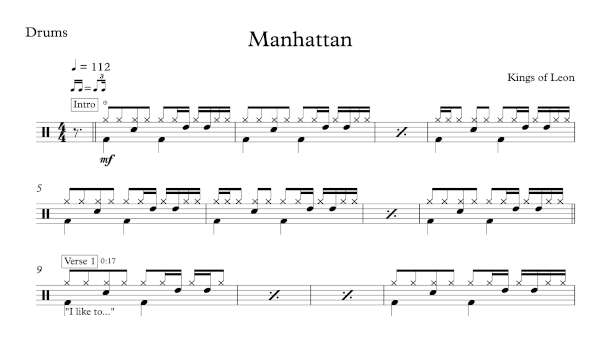 Drum Sheet Music for “Manhattan” by Kings of Leon.