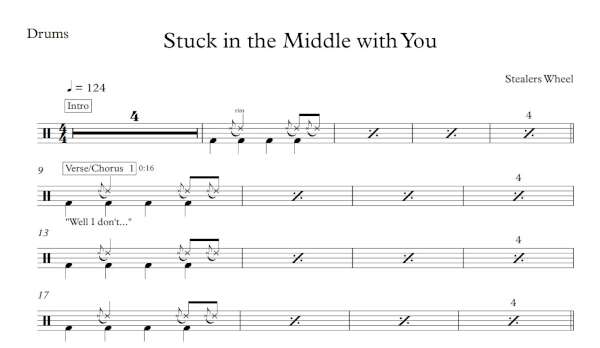 Drum Sheet Music for “Stuck in the Middle with You” by Stealers Wheel.