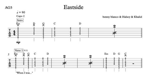 Strum Guitar Tablature for “Eastside” by benny blanco & Halsey & Khalid