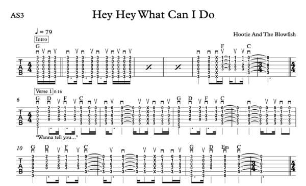 Strum Guitar Tablature for “Hey Hey What Can I Do” by Hootie And The Blowfish