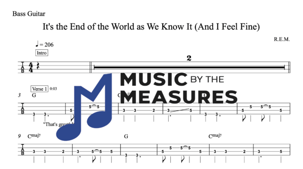 You need to be a member to be able to purchase this tab. Sign up nowBass Guitar Tablature for “It’s the End of the World as We Know It (And I Feel Fine)” by R.E.M.