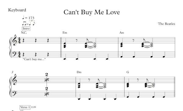 Keyboard Sheet Music for “Can’t Buy Me Love” by The Beatles.