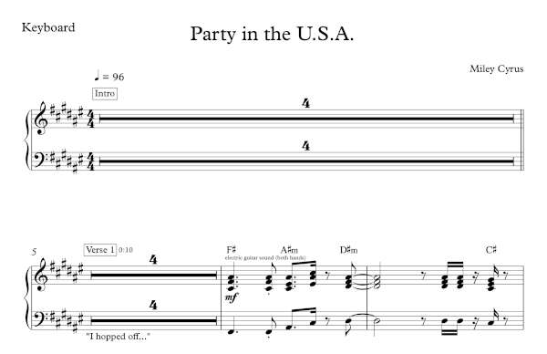 Keyboard Sheet Music for “Party in the U.S.A.” by Miley Cyrus.
