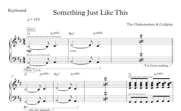 Keyboard Sheet Music for “Something Just Like This” by The Chainsmokers & Coldplay.