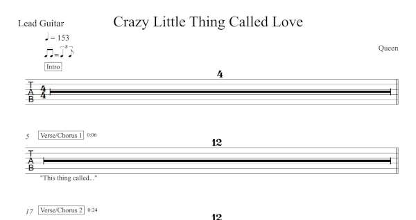 Lead Guitar Tablature for “Crazy Little Thing Called Love” by Queen.