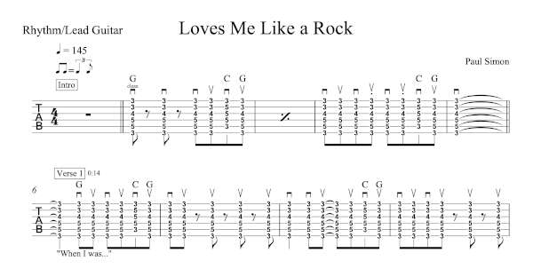 Lead Guitar Tablature for “Loves Me Like a Rock” by Paul Simon.