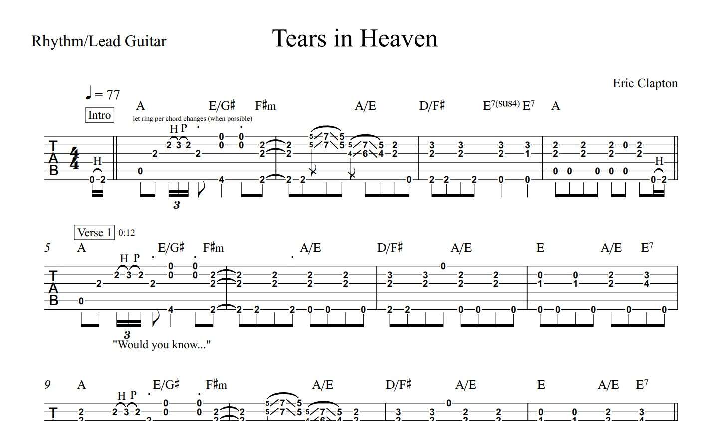 Lead Guitar Tablature for “Tears in Heaven” by Eric Clapton.