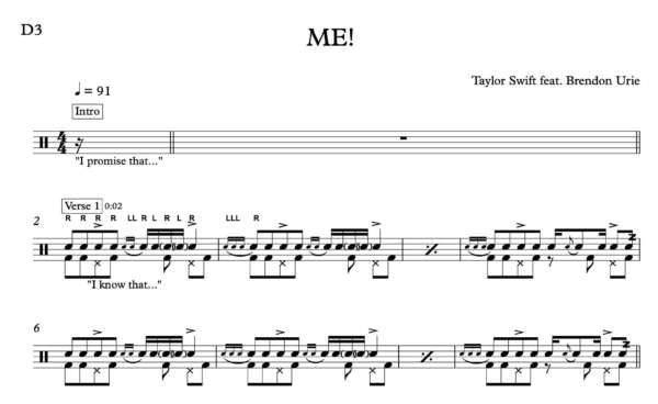 Drum Sheet Music for “Me!” by Taylor Swift feat. Brendon Urie
