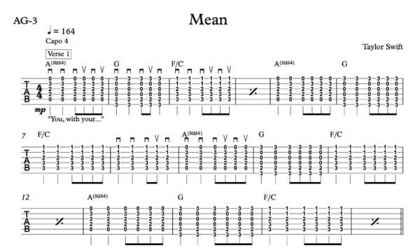 Strum Guitar Tablature for “Mean” by Taylor Swift