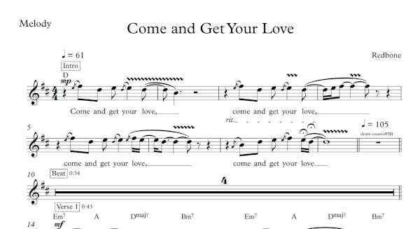 Melody Sheet Music for “Come and Get Your Love” by Redbone.