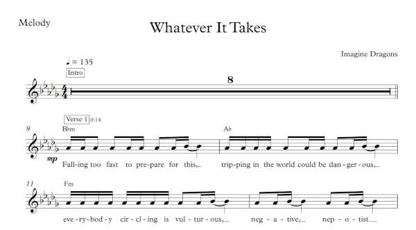 Melody Sheet Music for “Whatever It Takes” by Imagine Dragons.