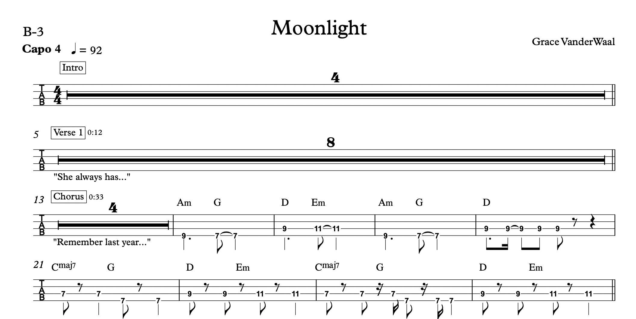 Bass Guitar Tablature for “Moonlight” by Grace VanderWaal