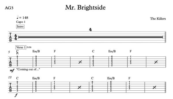 Strum Guitar Tablature for “Mr. Brightside” by The Killers