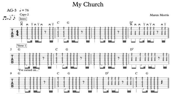 Strum Guitar Tablature for “My Church” by Marren Morris