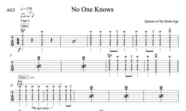 Strum Guitar Tablature for “No One Knows” by Queens of the Stone Age