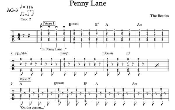 Strum Guitar Tablature for “Penny Lane” by The Beatles