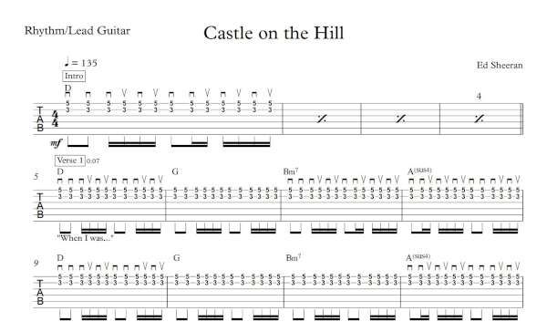 Rhythm Guitar Tablature for “Castle on the Hill” by Ed Sheeran.
