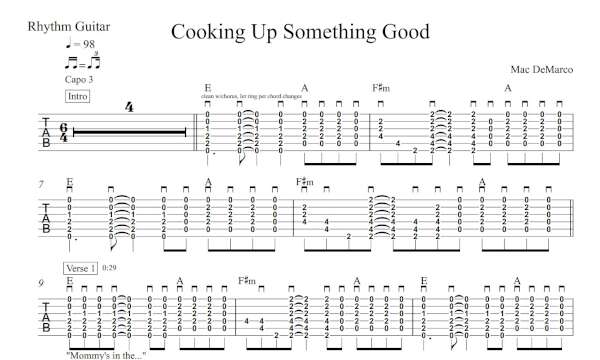 Rhythm Guitar Tablature for “Cooking Up Something Good” by Mac DeMarco.