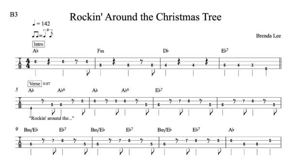 Bass Guitar Tablature for “Rockin’ Around the Christmas Tree” by Brenda Lee