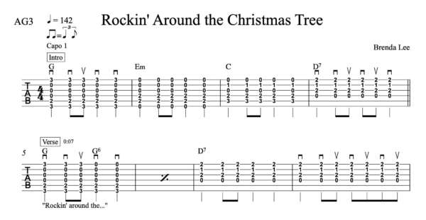 Strum Guitar Tablature for “Rockin’ Around the Christmas Tree” by Brenda Lee