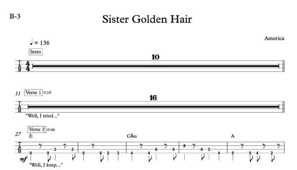 Bass Guitar Tablature for “Sister Golden Hair” by America