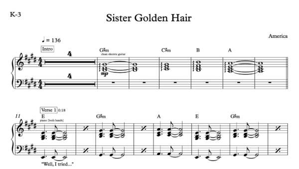 Keyboard Sheet Music for “Sister Golden Hair” by America