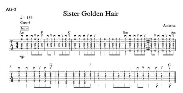 Strum Guitar Tablature for “Sister Golden Hair” by America