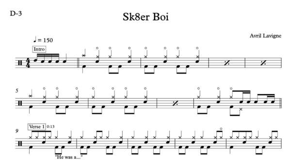 Drum Sheet Music for “Sk8er Boi” by Avril Lavigne