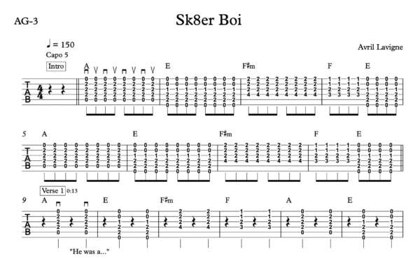 Strum Guitar Tablature for “Sk8er Boi” by Avril Lavigne