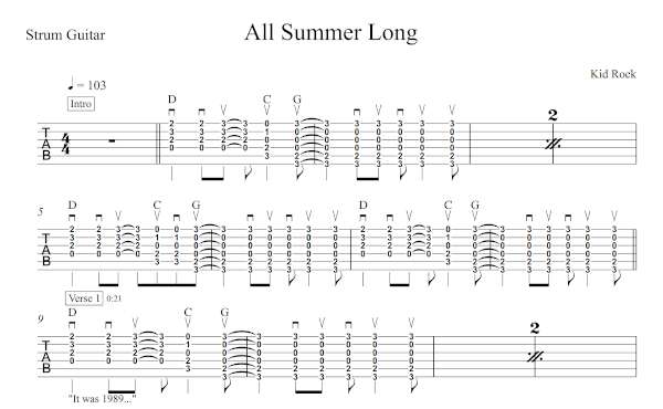 Strum Guitar Tablature for “All Summer Long” by Kid Rock.