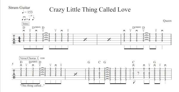 Strum Guitar Tablature for “Crazy Little Thing Called Love” by Queen.