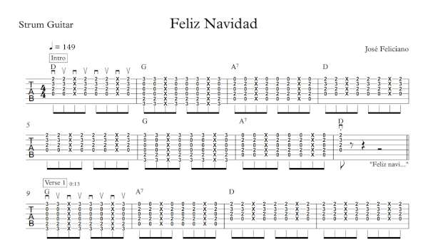 Strum Guitar Tablature for “Feliz Navidad” by Jose Feliciano.