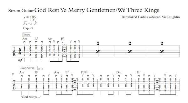 Strum Guitar Tablature for “God Rest Ye Merry Gentlemen/We Three Kings” by Barenaked Ladies with Sarah McLaughlin.