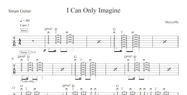 Strum Guitar Tablature for “I Can Only Imagine” by MercyMe.