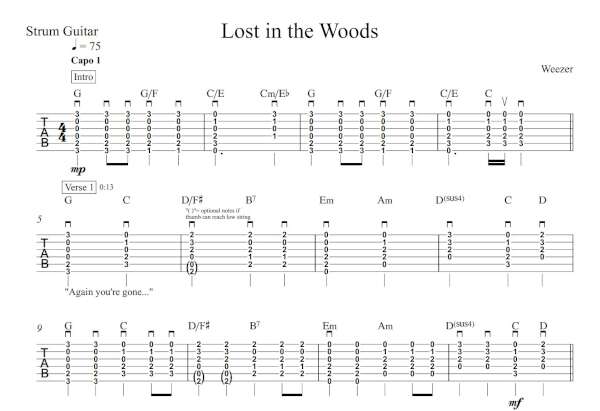 Strum Guitar Tablature for “Lost in the Woods” by Weezer.