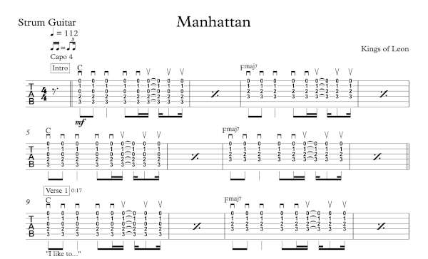 Strum Guitar Tablature for “Manhattan” by Kings of Leon.