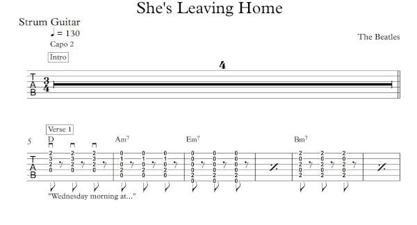 Strum Guitar Tablature for “She’s Leaving Home” by The Beatles.