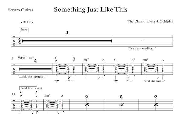 Strum Guitar Tablature for “Something Just Like This” by The Chainsmokers & Coldplay.